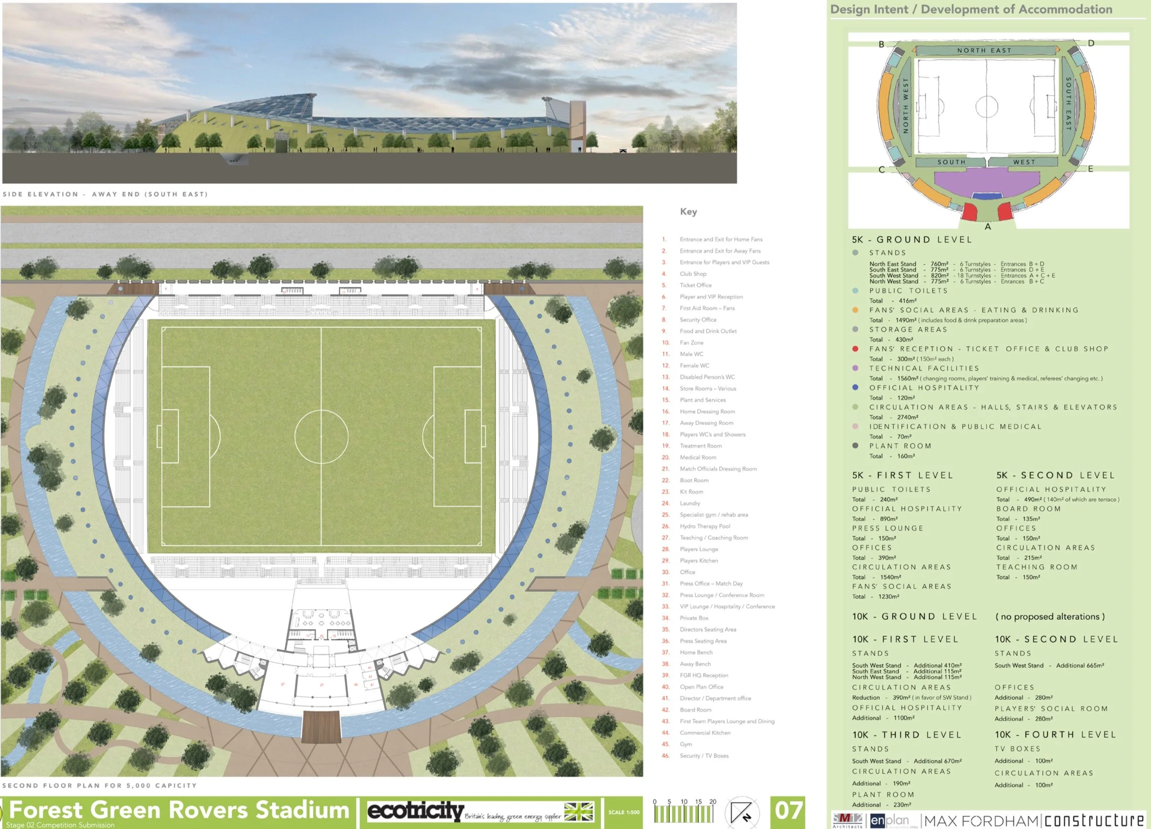 This is our design which was a finalist in the competition to design a new stadium and training facilities for Forest Green Rovers FC. Whilst not successful in the end we received great feedback and encouragement from the owner and his team of experts. Working with Constructure, Max Fordham and EnPlan the scheme provided a masterplan for the New home of football for FGR. The stadium needed to have a 5,000 capacity at the start, but able to grow to 10,000 as the club progressed through the years. The brief required training and conference facilities and needed to comply with all the EFL, FA, UEFA and FIFA requirements in terms of design and facilities provided. The stadium also needed to be as sustainable as possible both in terms of its construction and in its use. Our design was voted the best in a poll taken by Stroud News.
